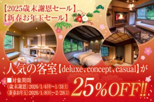 ■対象客室:deluxe、concept ■対象期間:1/4㈰~2/28㈯ ■内容:1泊2食付 ※歳末謝恩セールは12/12より、新春お年玉セールは1/5より予約受付開始