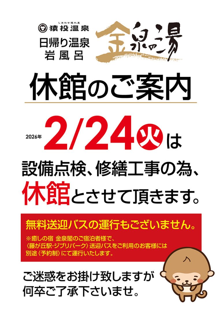2/24㊋は併設の日帰り温泉 金泉の湯が休館日となります。