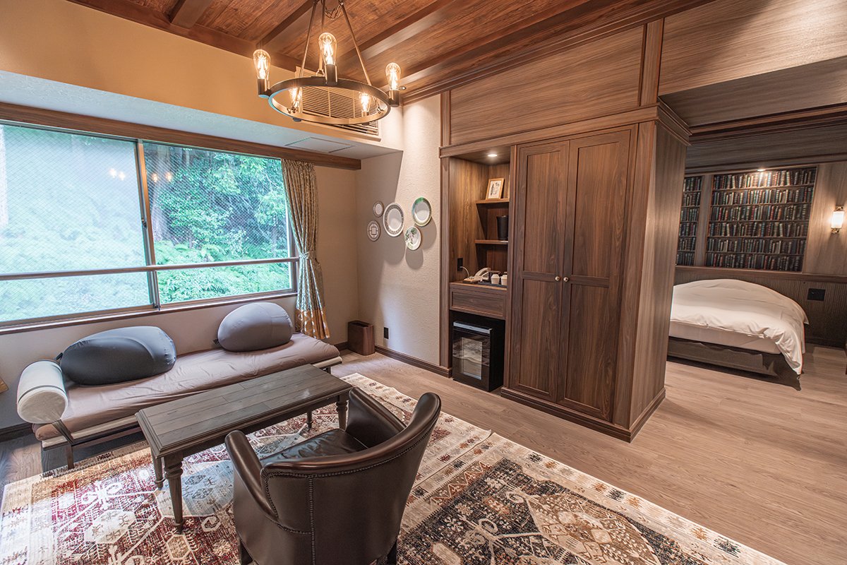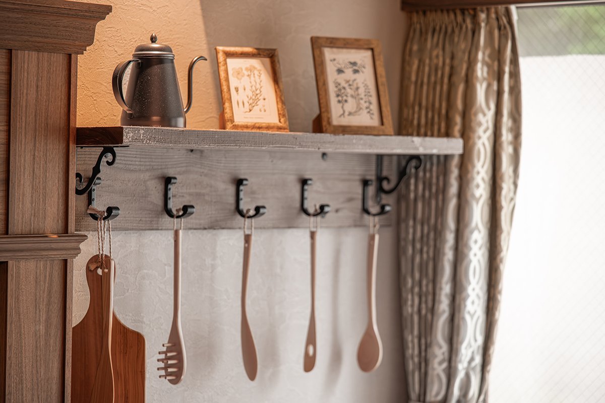 マントルピースのあるリビング、飾られた食器やキッチンツールは西洋の地を感じるだけでなく、一種の物語を思い出すかもしれません。ヘッドボードの魔術書が並ぶ本棚のデザインなど寝室では西洋にあった城にいるような気持ちを味わえるのではないでしょうか。