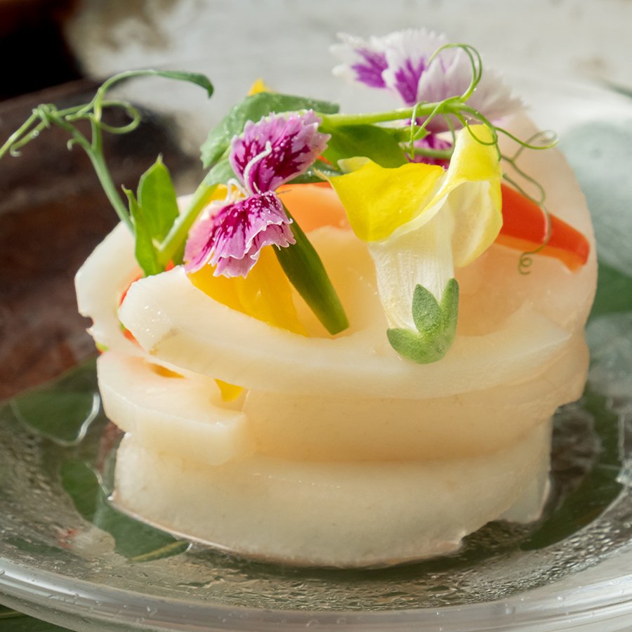 器にもこだわり抜いた色どりと見た目の美しさ、素材本来の味を生かした料理の数々は期待を裏切らない逸品揃い。料理人の手仕事から生まれる一品との出会い、余韻まで味わう喜びをご賞味くださいませ。