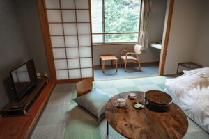 昭和のアンティークショップのような客室に入ると、丸テーブルが出迎え、コーナールームならではの斜めの窓は山の味わいと開放感を届けてくれる。